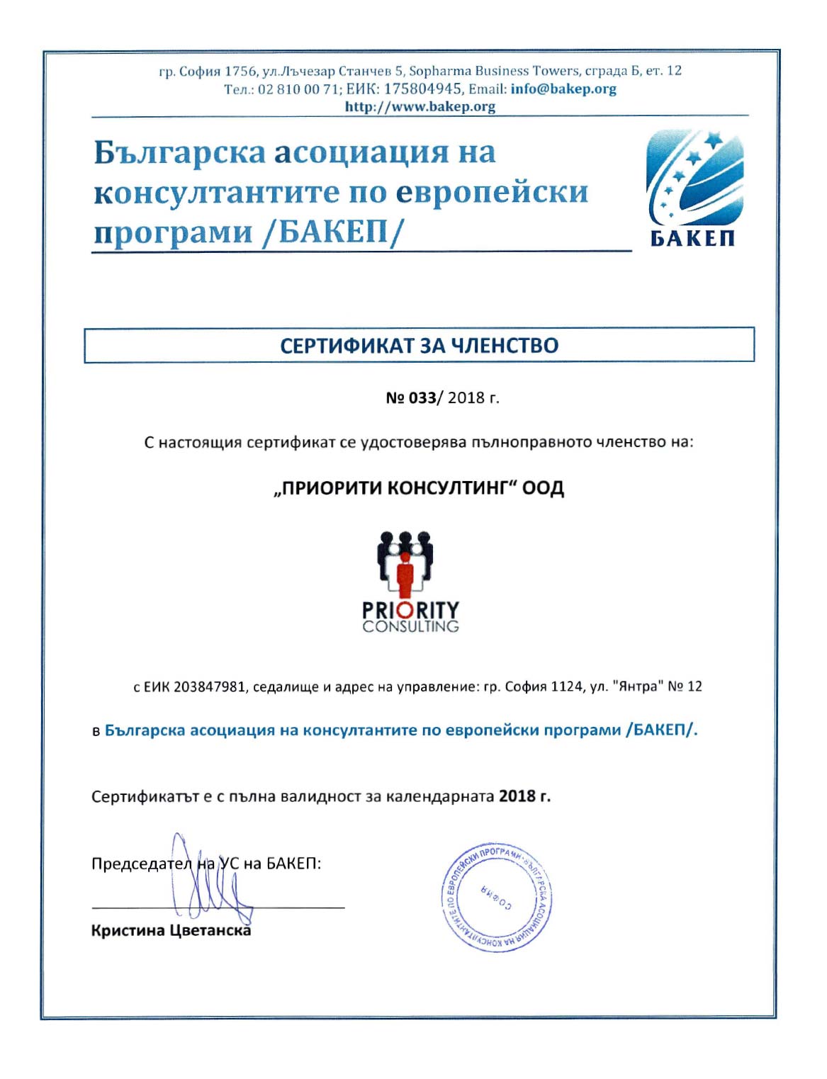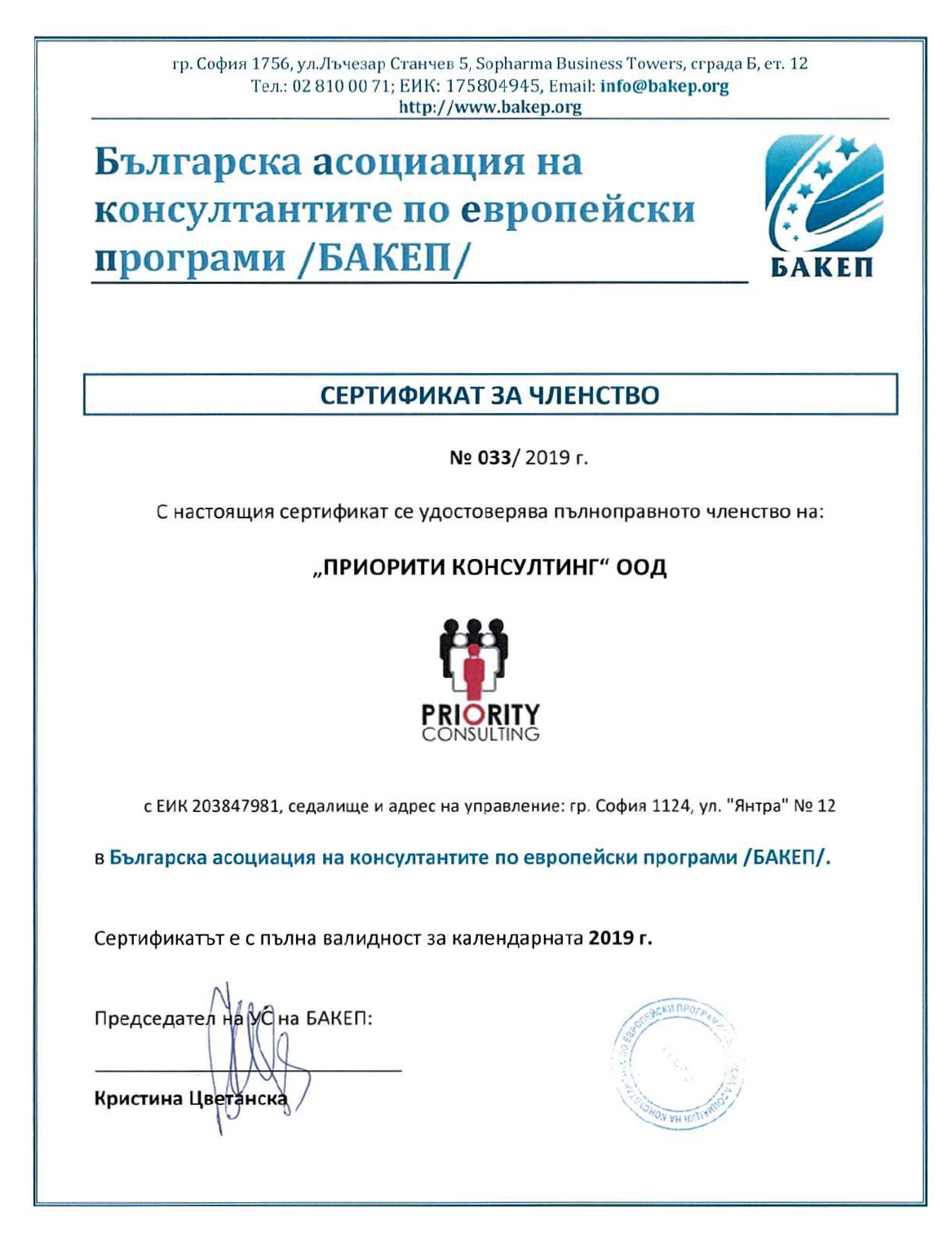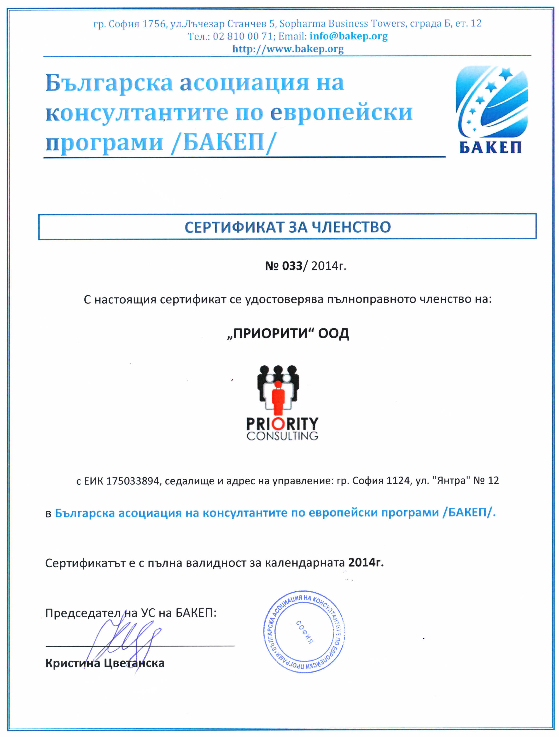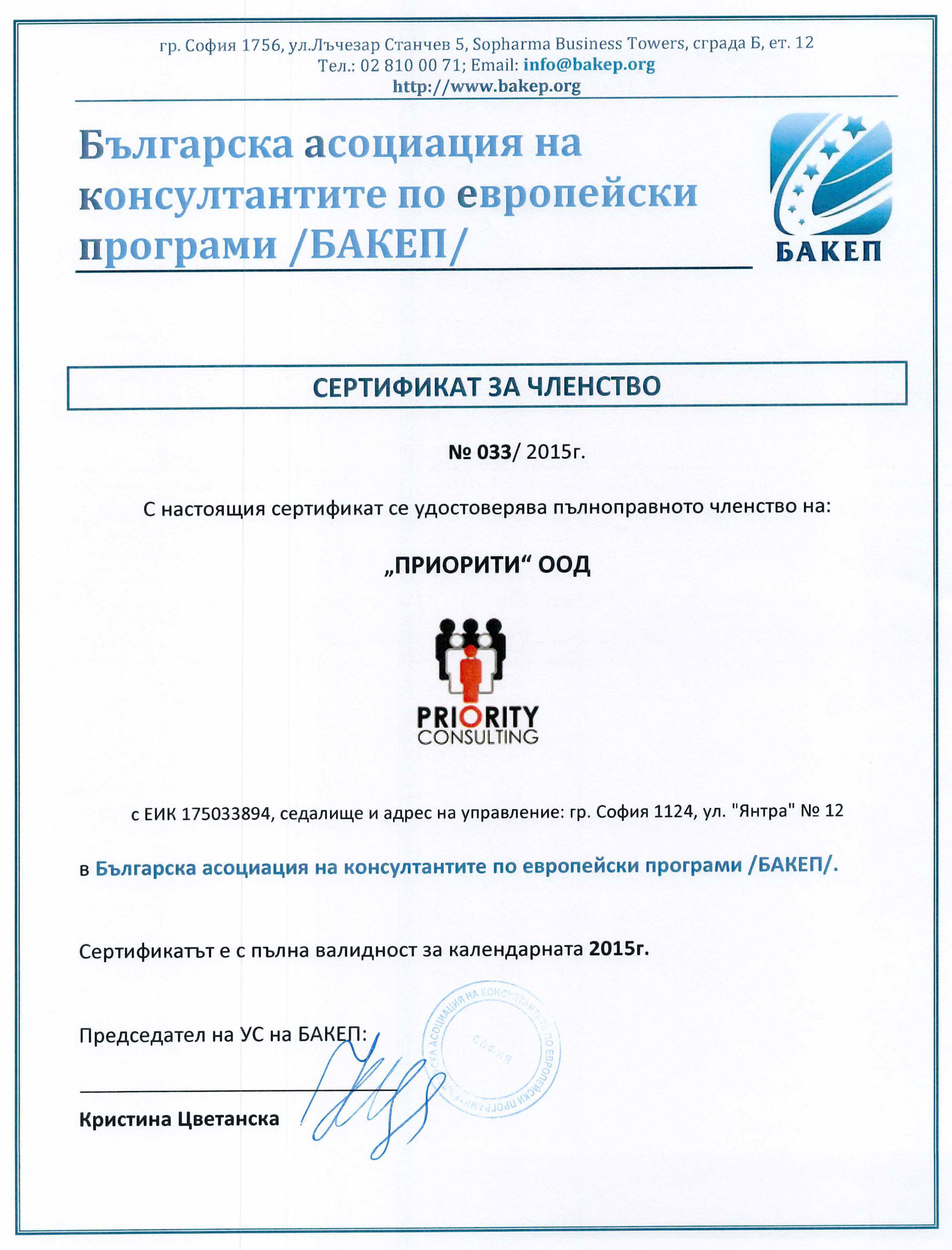 „ПРИОРИТИ КОНСУЛТИНГ“ е пълноправен член на „Българската асоциация на консултантите по Европейски програми“ (БАКЕП) от 2014 г.