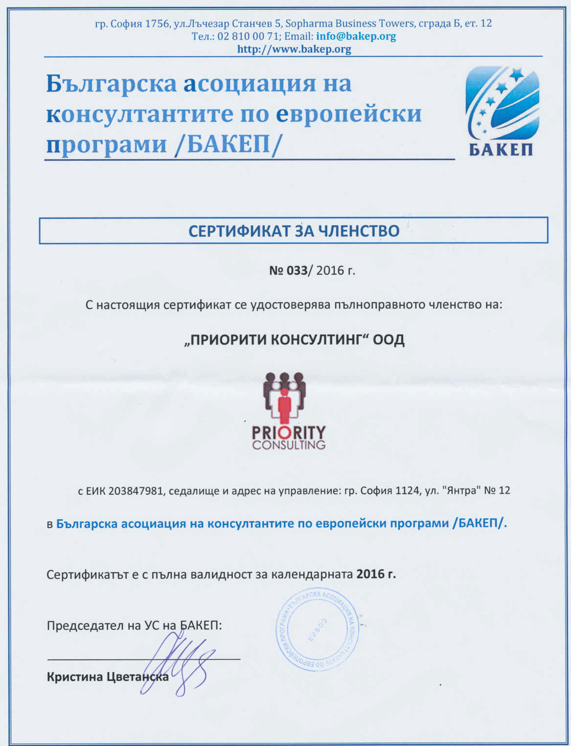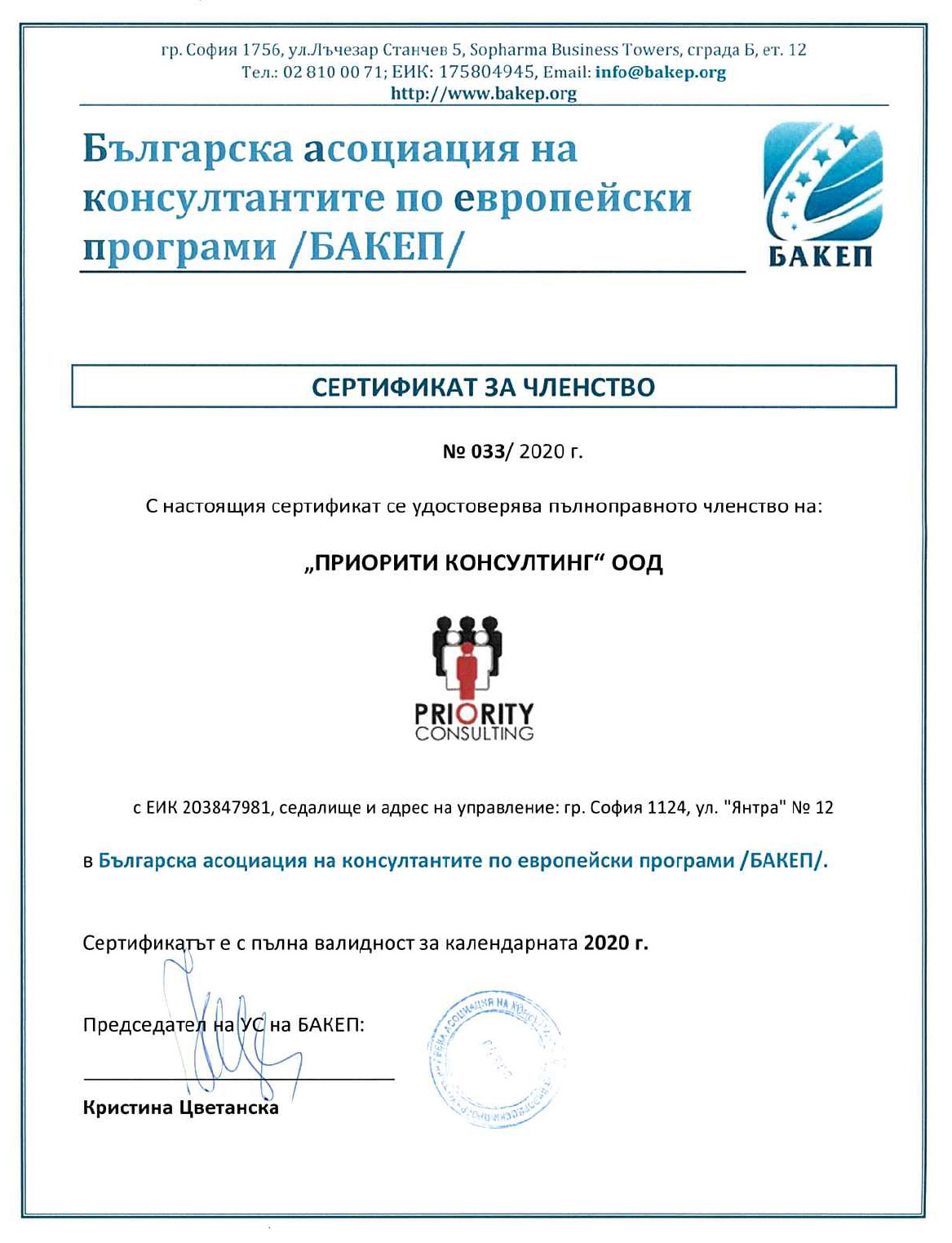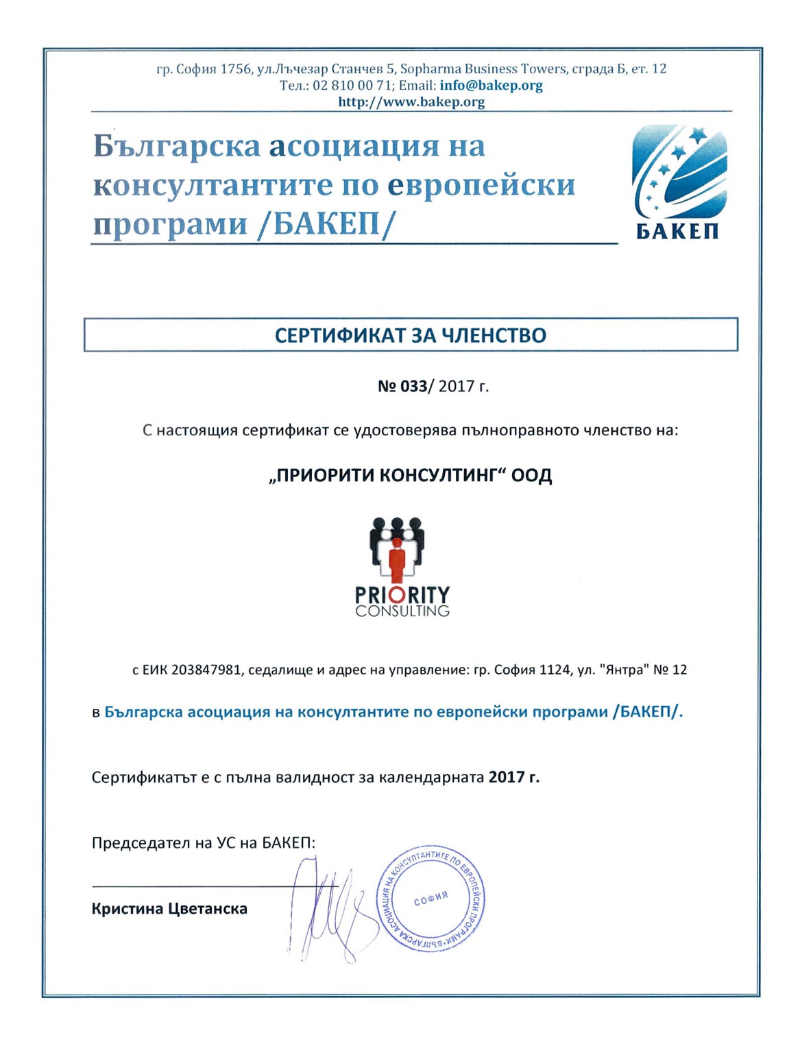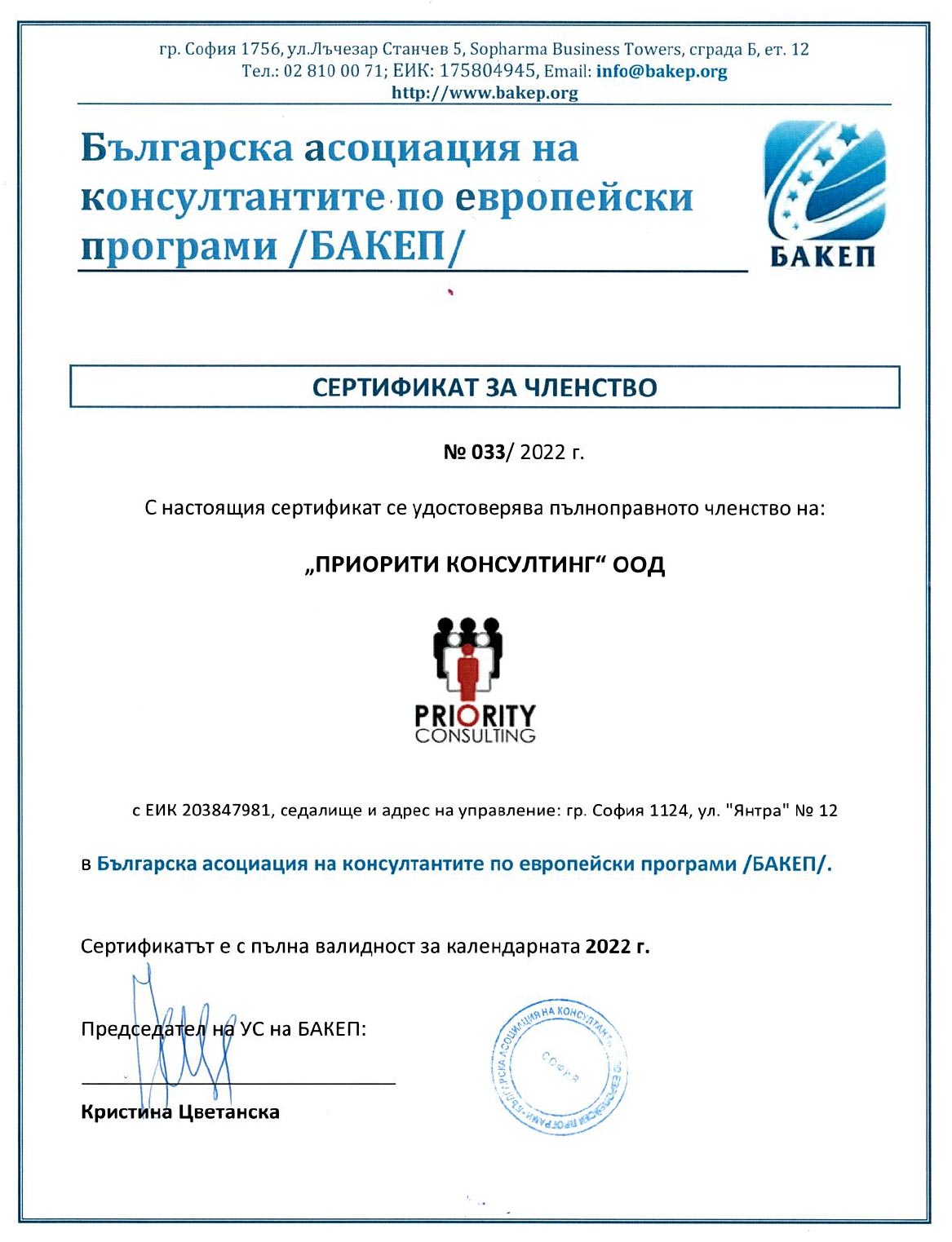 „ПРИОРИТИ КОНСУЛТИНГ“ е пълноправен член на „Българската асоциация на консултантите по Европейски програми“ (БАКЕП) от 2014 г.