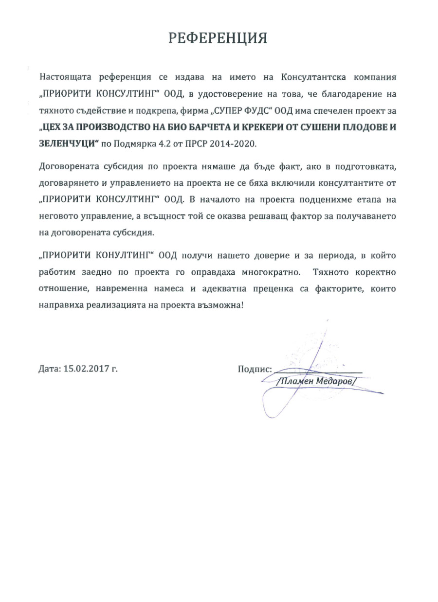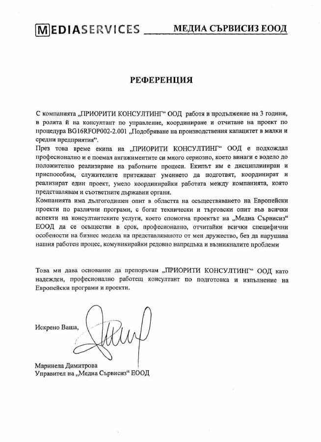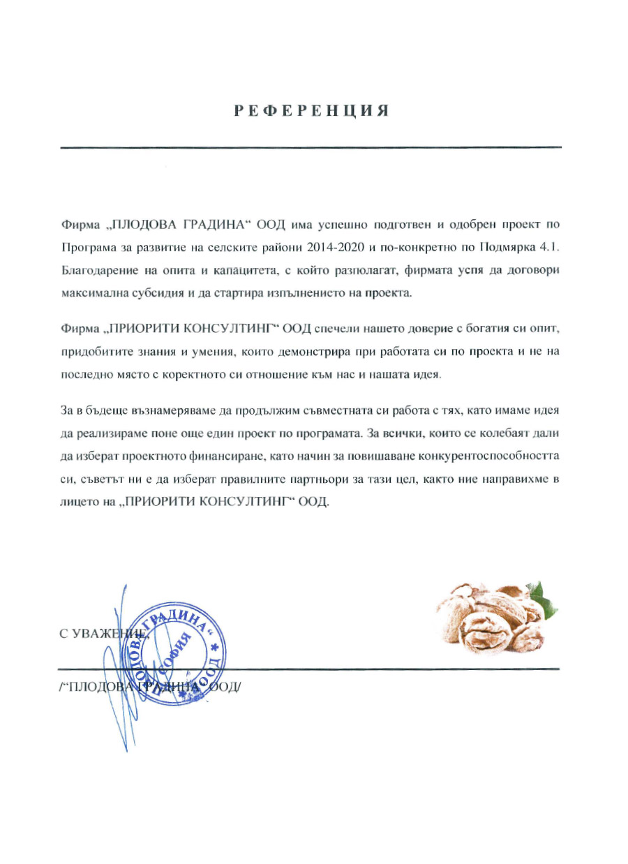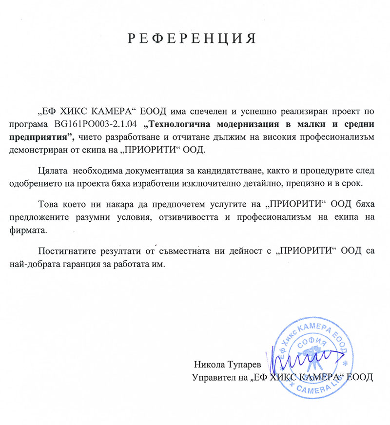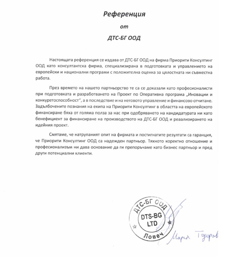 Целта ни е не просто да подкрепим бенефициентите в процеса на кандидатстване за безвъзмездно финансиране, а да осигурим максимална полза и дълготраен ефект за развитието им. Разработваме и подаваме проекти само след предварително проучване и оценка на дадена компания. По този начин предлагаме на клиентите си персонализирана услуга съобразена индивидуалните им нужди и можем да гарантираме висок процент на успеваемост.